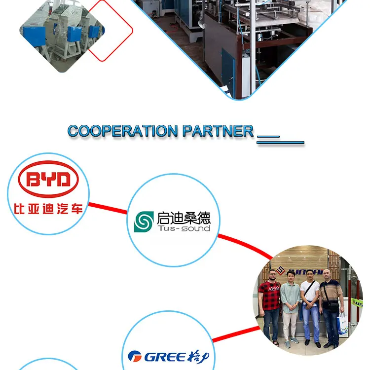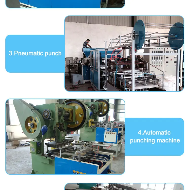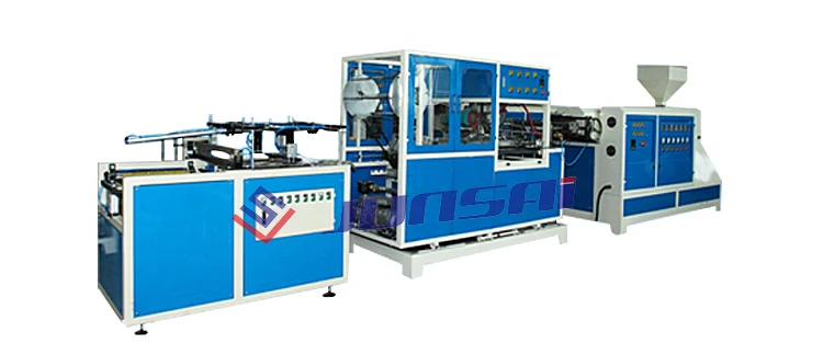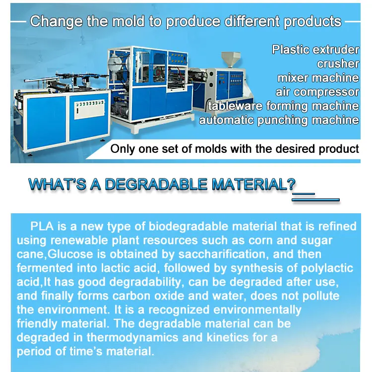 | Full configuration: | (Change the mold, you can produce different products) Plastic extruder, tableware molding machine, automatic punching machine, pulverizer, mixer, air compressor, mold |
