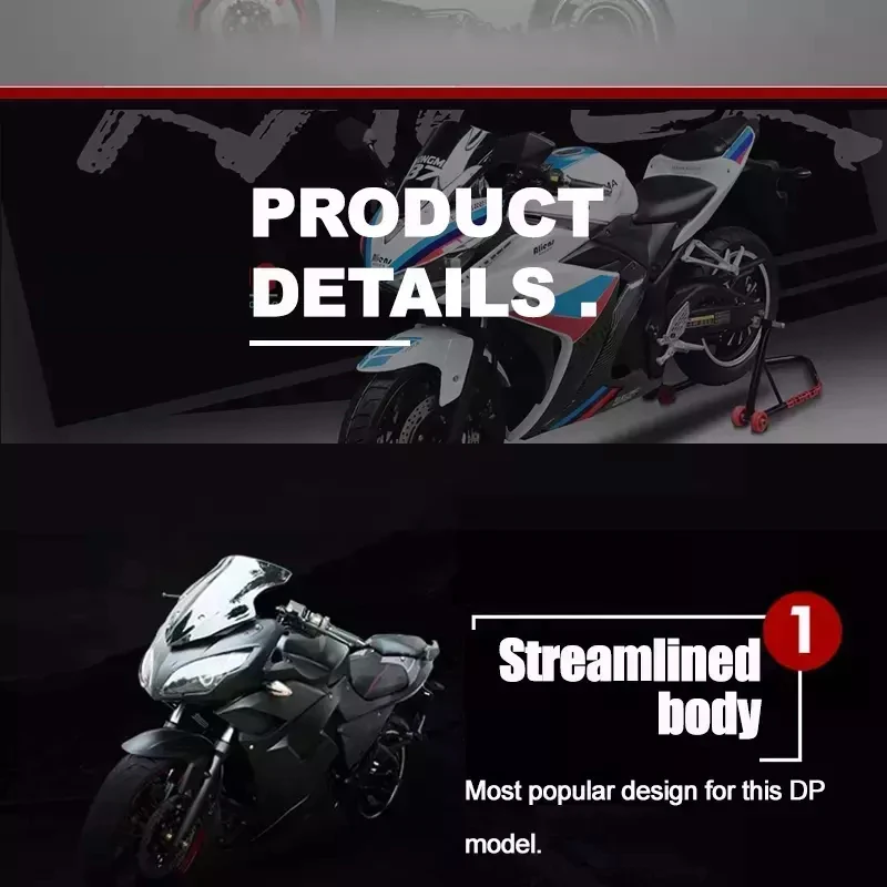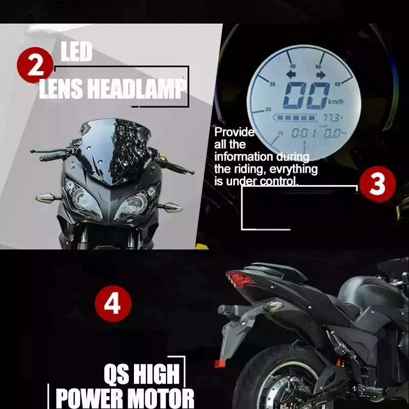 | MAX SPEED:110KM/H | FULL CHARGE DISTANCE:50-180KM | BRAKE:F&R: DISC | SLOPE:21° | FRAME:HIGH-TENSILE STEEL |