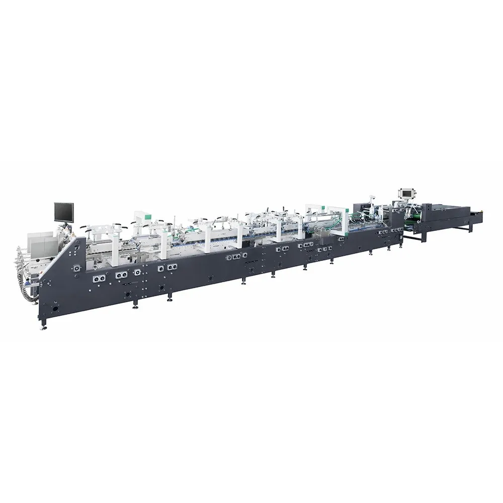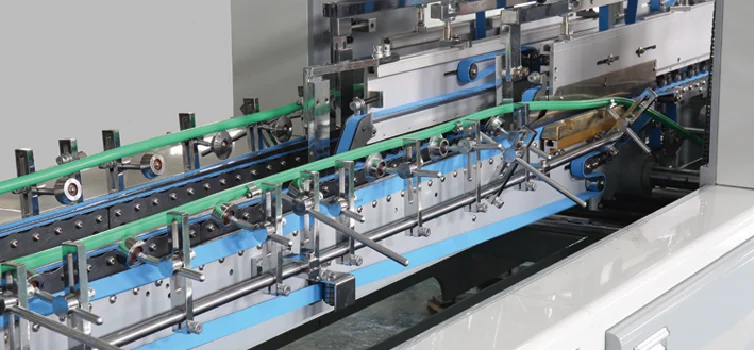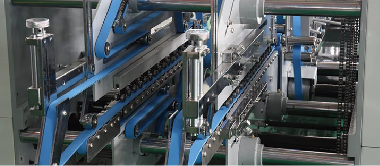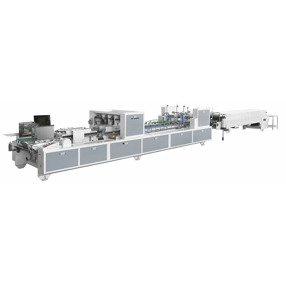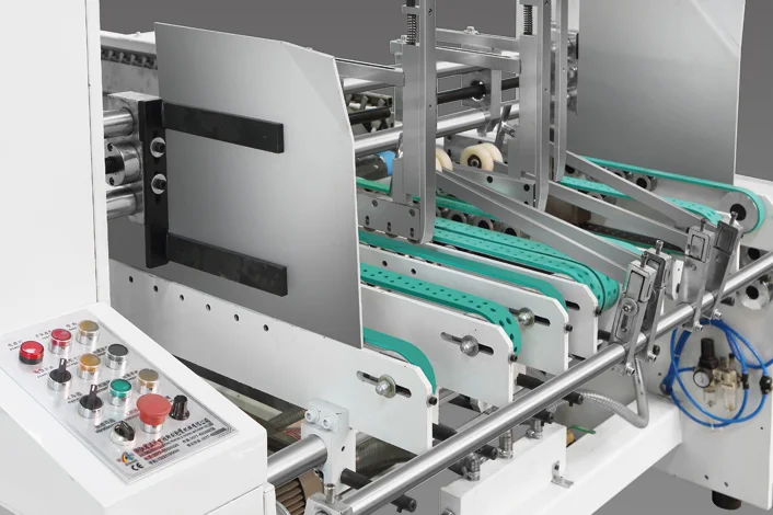 ●The middle up and down transmission module can fold boxes synchronously or alternately●Adjust the pressure with the upper and lower belts.For flute A,B corrugated board,overlapping and jogger devices are equipped to ensure box gluing well.