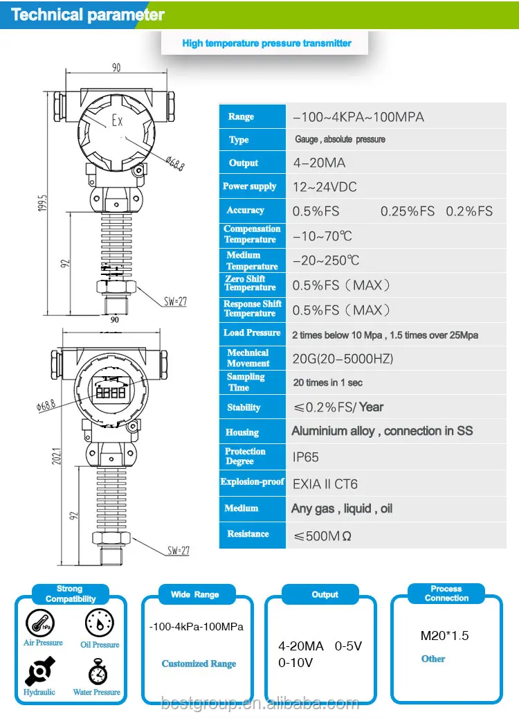 | Protection: | IP65; | Pressure connection: | M20*1.5 Customization; |