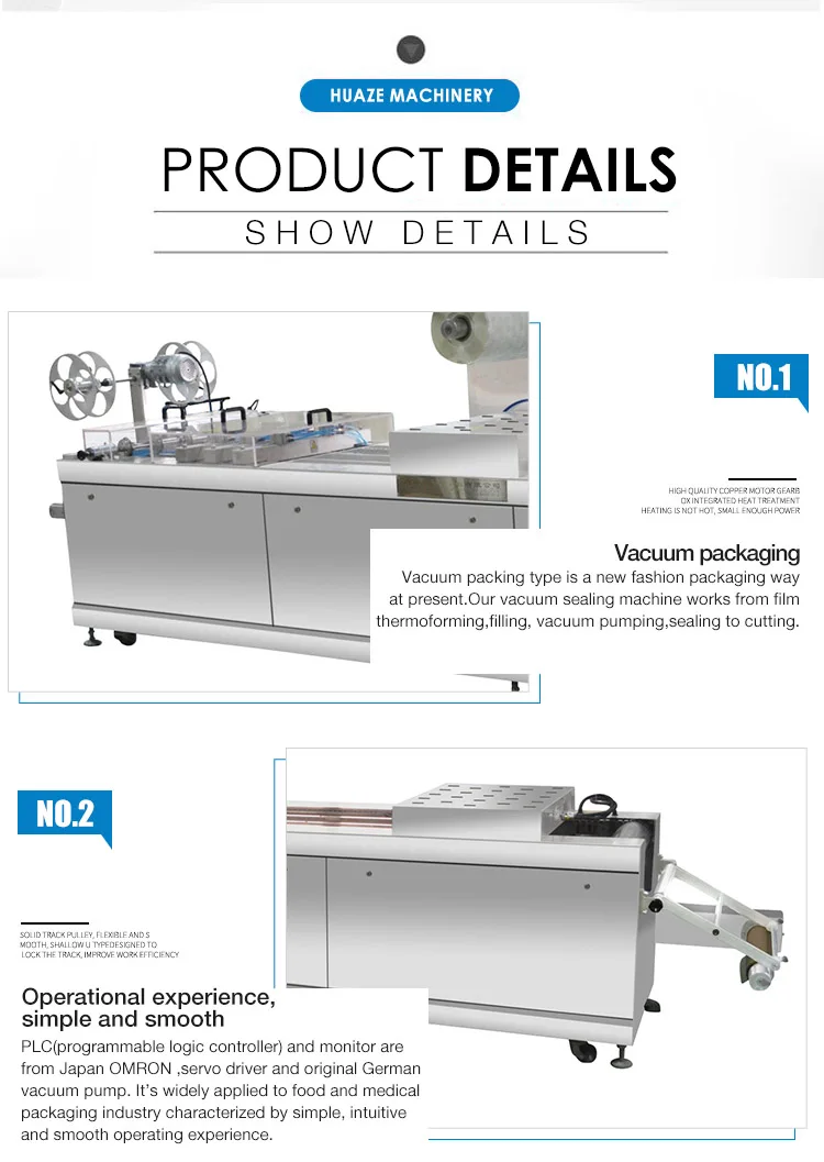 PLC(programmable logic controller) and monitor are from Japan OMRON ,servo driver and original German vacuum pump. It’s widely applied to food and medical packaging industry characterized by simple, intuitive and smooth operating experience.