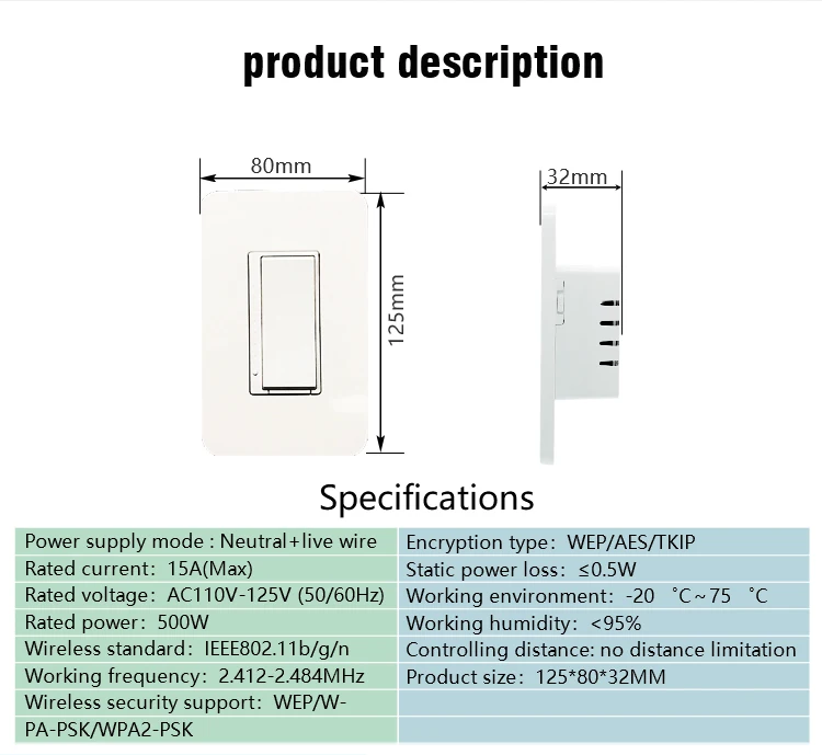 | Product name: | New style wifi dimmer switch; | Panel Material: | PC Flame Resistant Material; |
