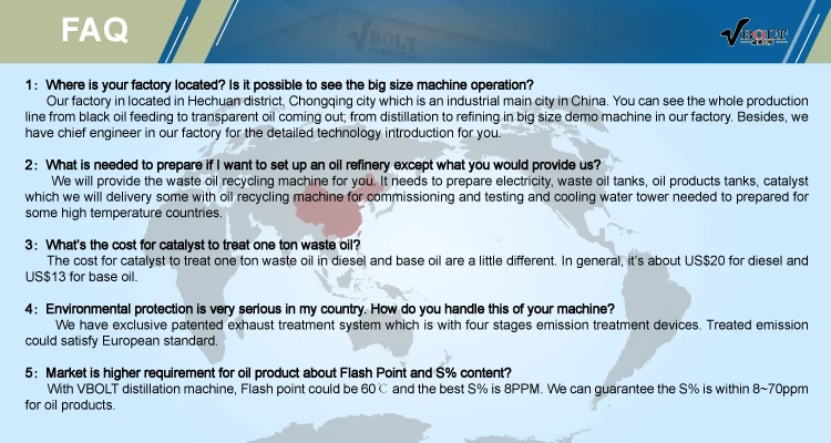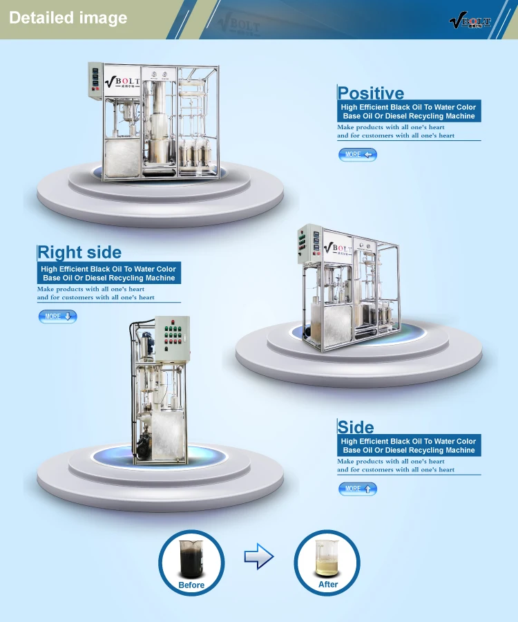 Vbolt oil distillation machine is suitable for all kinds of used oil (such as used engine oil, waste motor oil,waste industrial oil , heavy fuel oil , oil sludge etc.), pyrolysis oil (such as tire pyrolysis oil, plastic pyrolysis oil etc. ) recycling to light and heavy diesel oil or base oil. It adopts high speed centrifuge to separate water content from black oil material, and then adopts thin film evaporator to get ride of light components like gasoline, kerosene and so on. Then use advanced membrane distillation system to improve oil gasification. Oil gas will finish catalytic reaction to produce diesel in the distillation column. Higher speed distillation and catalytic reaction combining with large area condensers, the indices of produced oil is very good which could be used for engines directly. Vbolt also supplies exclusive refining system to improve the quality of diesel or base oil product from distillation machine. After refining, the quality of diesel or base oil is with good stability performance and bright color like water and no any bad smell.