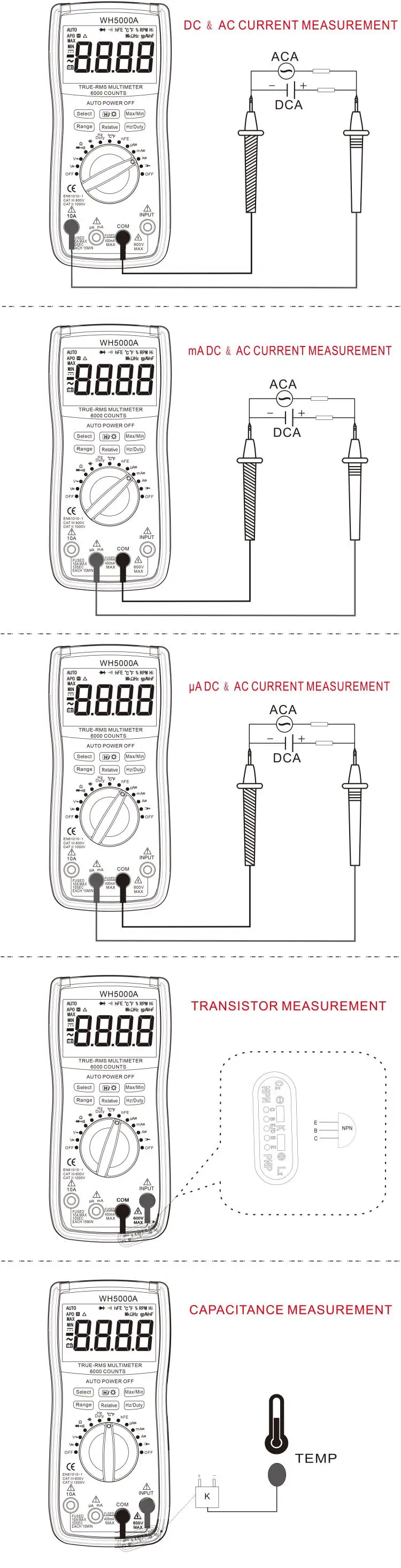 Characteristic All round observation Large LCD Easy to read in dark condition with blue backlight Data hold function for easy reading after measurement With MAX and MIN value display Double fuse and anti-burn design, safe and reliable With frequency and temperature test function With PVC shockproof holster Can measure high current with clamp meter WH3302 or WH3303 with 2mF capacitance test A magnetic button hook is convenient to adsorb on the surface of the iron object. | Technology features DCV: 60m-600m-6-60-600V ±0.5% ACV: 60m-600m-6-60-600V ±1.0% DCA: 600u-6000u-60m-600m-10A ±1.8% ACA: 600u-6000u-60m-600m-10A ±2.0% Resistance: 600-6K-60K-600K-6M-60MΩ ±1.0% Capacitance:60n-600n-6u-60u-600u-60mF ±5.0% Frequency: 9.99~9.99MHz ±3.0% Temperature: -20ºC~1000ºC/-4ºF~1832ºF ±2.0% Duty cycle: 0.1%~99.9% ±0.1% DCA(with extra clamp meter WH3302 or 3303):0A-600A ±1.5% ACA(with extra clamp meter WH3302 or 3303):0A-600A ±1.5% | Description LCD size: 64x42mm Max display: 5999 Low battery indication: yes Overload protection: yes Auto range: yes Diode test: yes Transistor test: yes Continuity buzzer test: yes Auto power off: yes Data hold: yes Backlight: yes Power supply: one 9V 6F22 batter Product size: 188x81x48mm Product weight: about 357g (with holster) Standard accessories: meter (with battery), holster, multi-function socket, test lead, thermocouple, manual 600A clamp jaw (optional) |