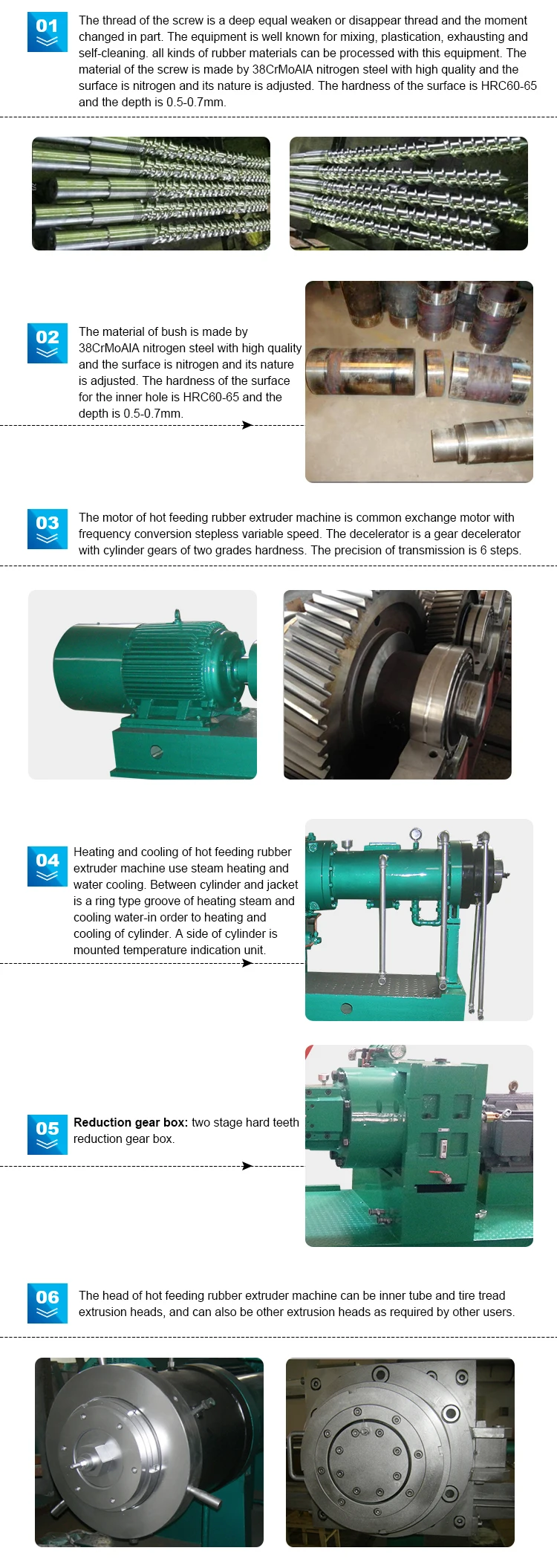 Hot feeding rubber extruder machine can be used for the shaping extrusion of various kinds of rubber products, rubber products, rubber wrap up for the out layer of the wire and electric cable and to do the rubber filter extrusion as well.