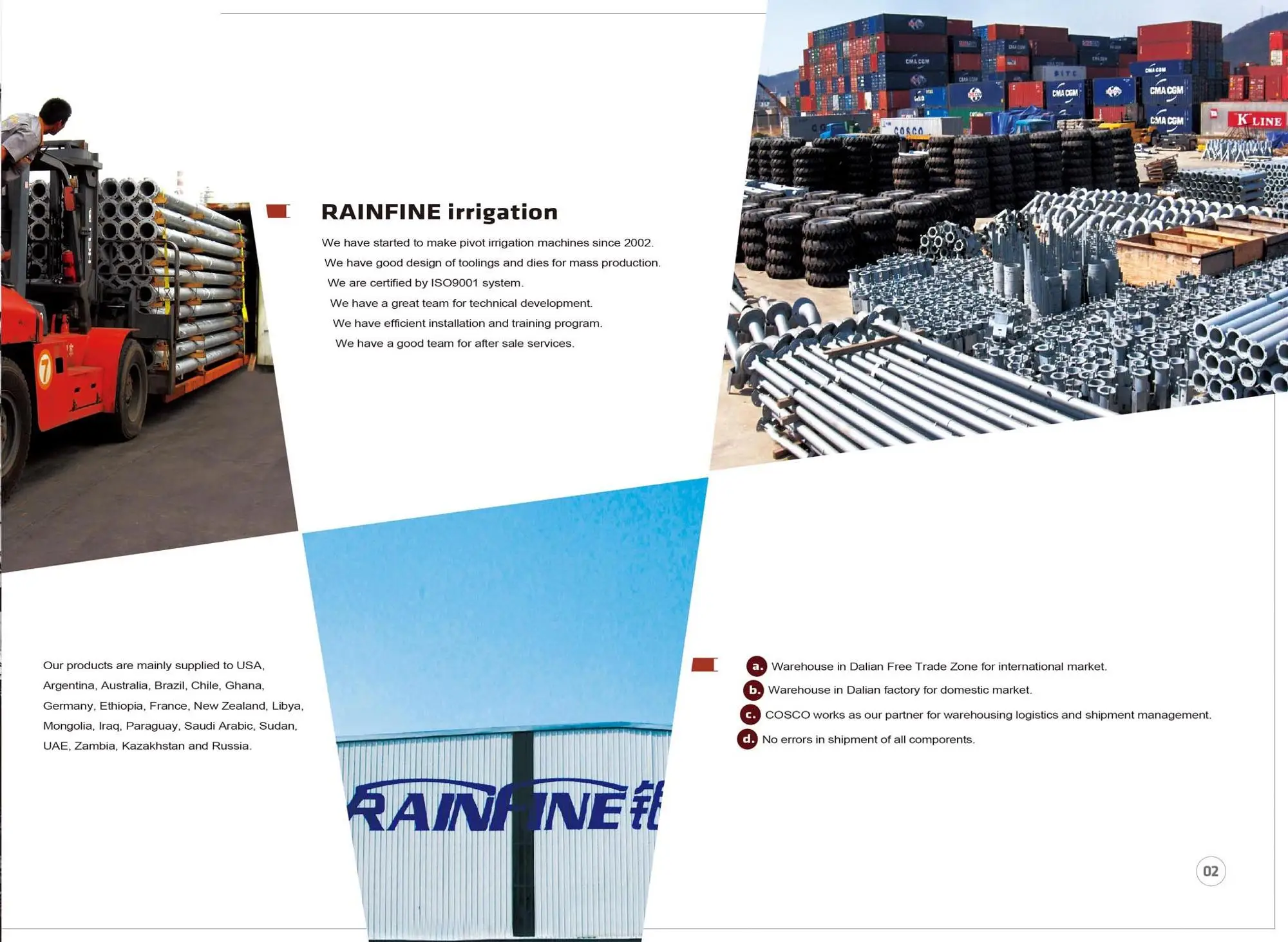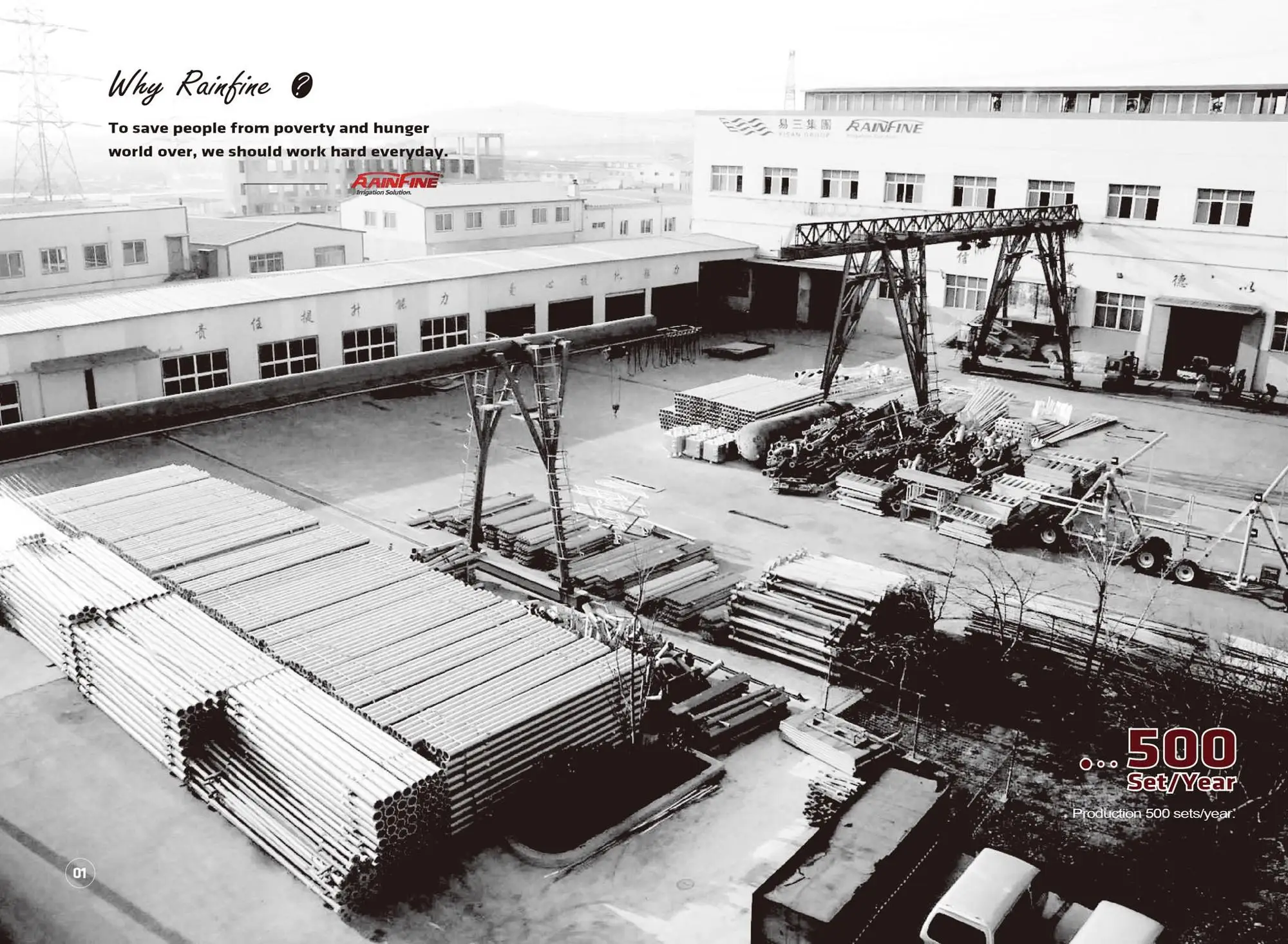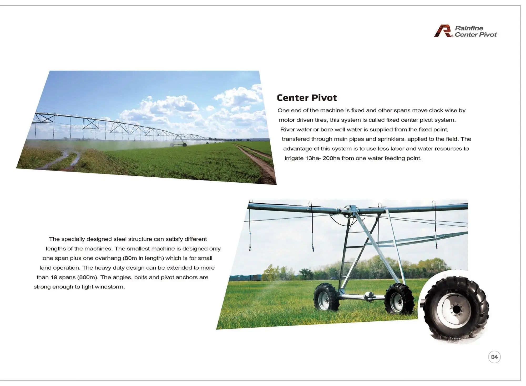 Rainfine manufacturing is a joint venture company with Yisan group located in Dalian China. We cooperated with American companies and European manufacturers who are specialized in center pivot and lateral move system. We have access to the most advanced technology in irrigation field. In addition, we have implemented ISO 9001-2008 system, as well as the advanced tooling and die system, which enhance our productivity and reduce the production costs. As a result, our center pivot system is reliable with high quality, excellent performance, high efficiency and simple operation.