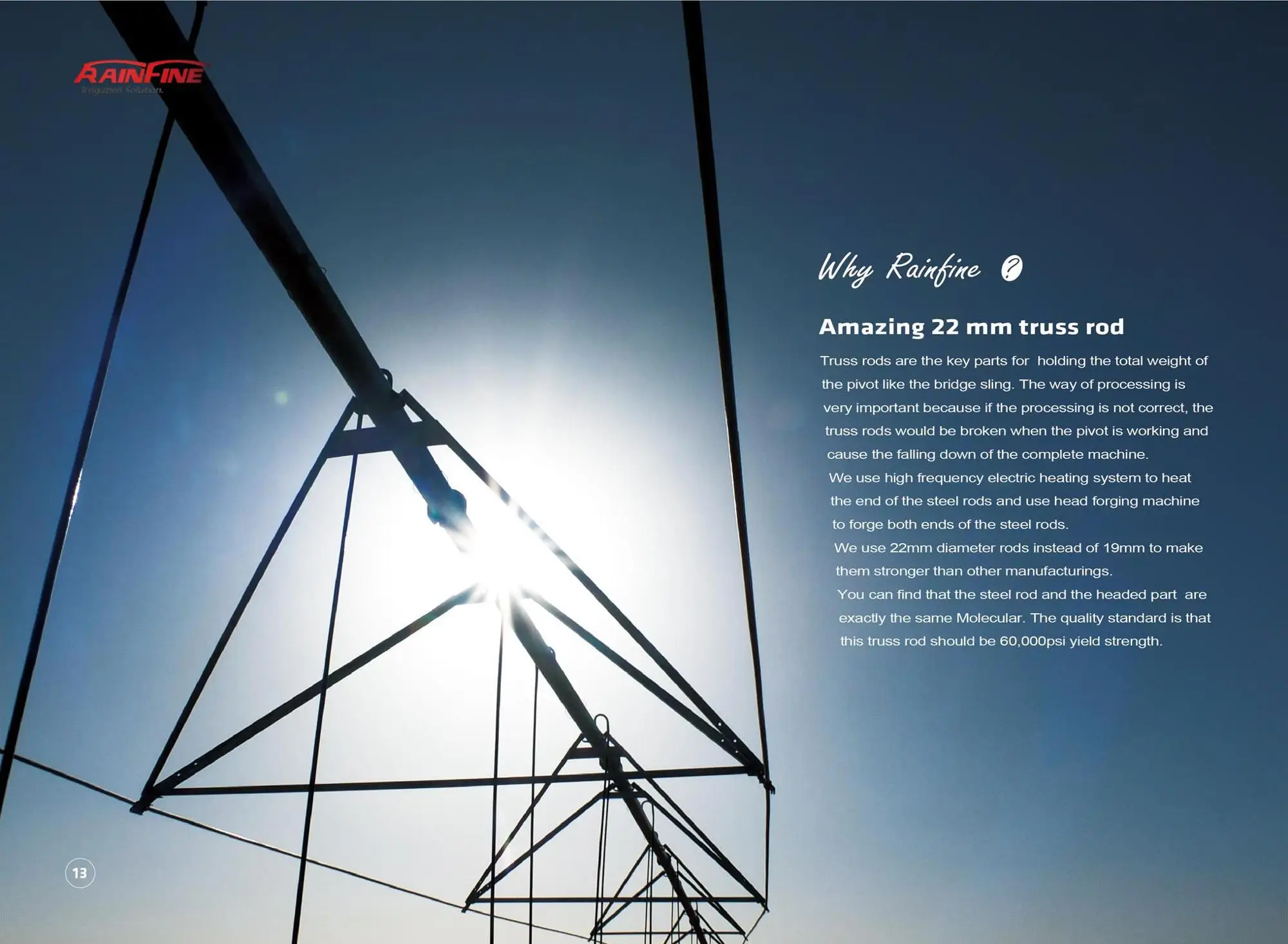 Rainfine started the pivot manufacturing since 2002, now has become a high-tech enterprise that specializes in research, development, production, service, and marketing of water-saving irrigation equipment. Both technology development and production capacity comply with American and European standards.