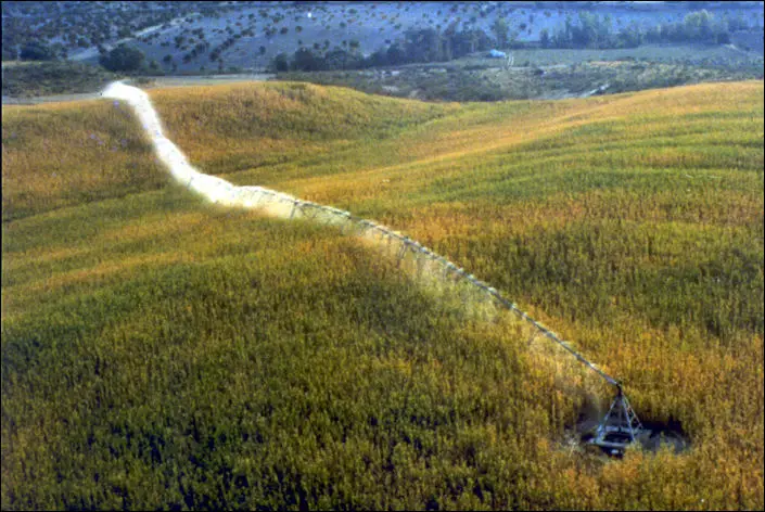 One end of the machine is fixed and other spans move clock wise by motor drive tires, which is called fixed center pivot system.