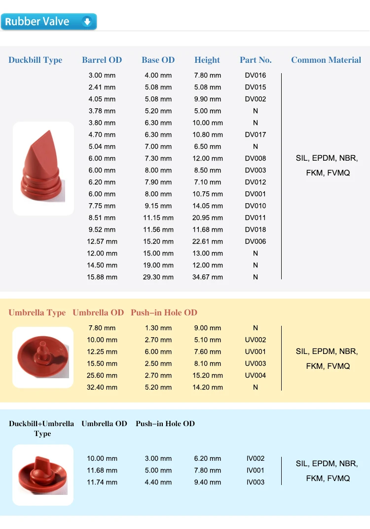 | Body | Fluorosilicone, silicone, NBR (silicone umbrella valve) | ||