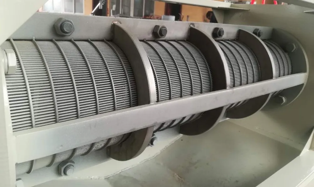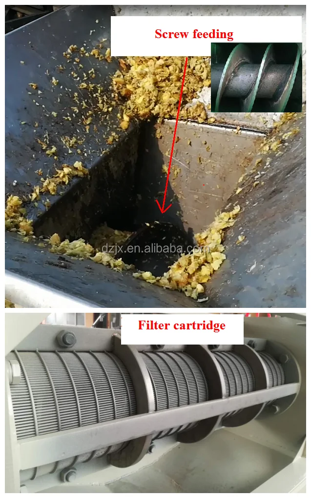 Feeding raw material into the screw press separator,the screw device will press the material continuously to the separator.Material between screw blande and filter cartridge to be squeezed.The liquid material pass through the Filter cartridge under the pressure , and the solid material discharge from the outlet .