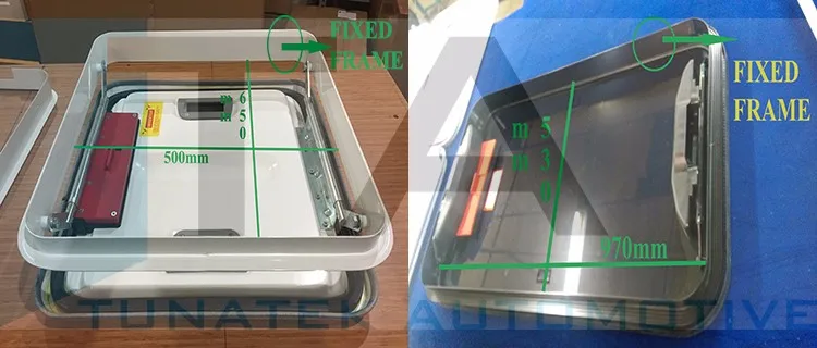 There are many different sizes in each roof hatch models. So how should you choose correct size for your work? As shown above pictures, roof hatches have got a fixed frame to be placed on the roof of vehicle. These sizes are referring to the inner dimensions of this fixed frame. Please keep in mind that the longer is refers to (lenght) from driver to the back side of the vehicle.