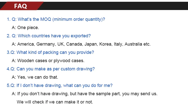 | Machining: | CNC machining center,boring,milling,grinding,etc; | Testing: | CMM testing and 100% by engineers; |