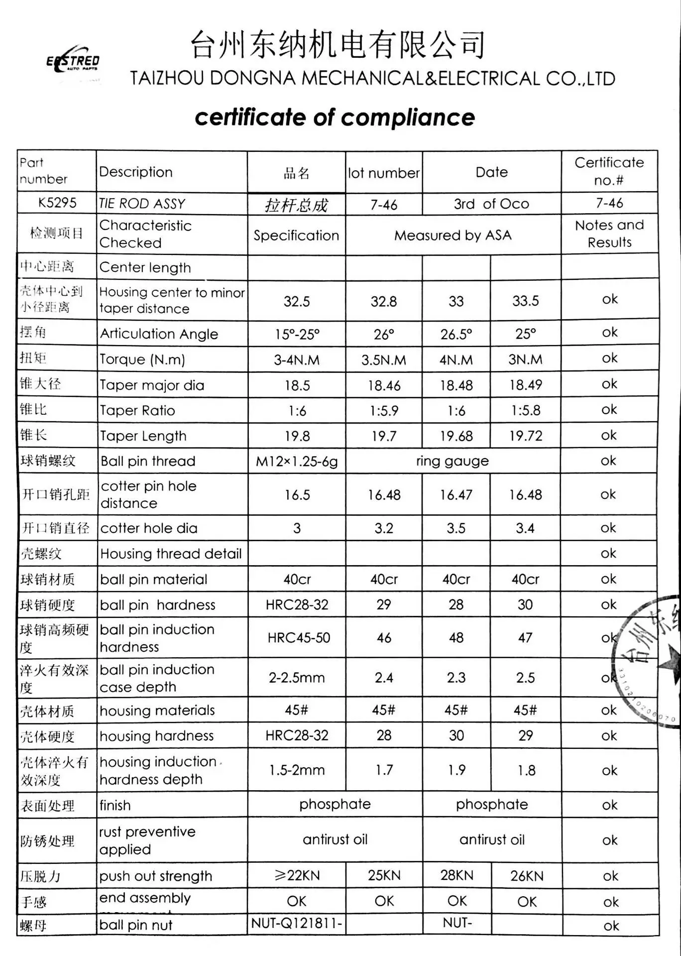 | Selling Units: | Multiple of 500; | Product Name: | Tie Rod End; |