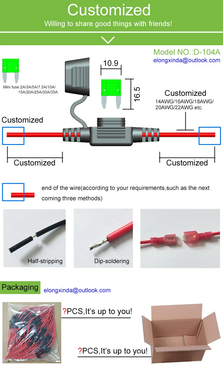 This product is a blade fuse holder for mini blade fuse (for D-801). Wire length and insulation color can be customized upon request. The color of the body also can be customized( the most common clor of body is black and red). Welcome to contact for details.