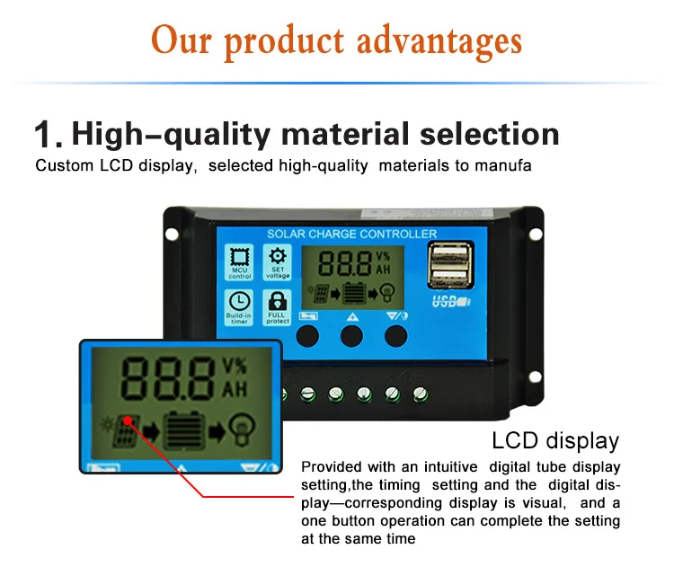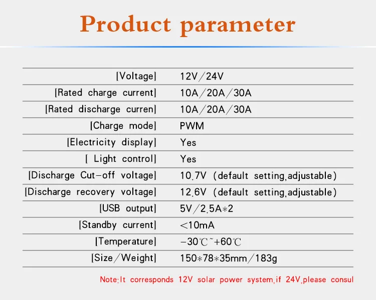| Package Type: | 12V/24V 10a 20a 30a pwm Solar Charge Controller standard carton packaging 100pcs/carton size: 69*40*36cm; | Size/Weight: | 133*70*35mm/132g; |