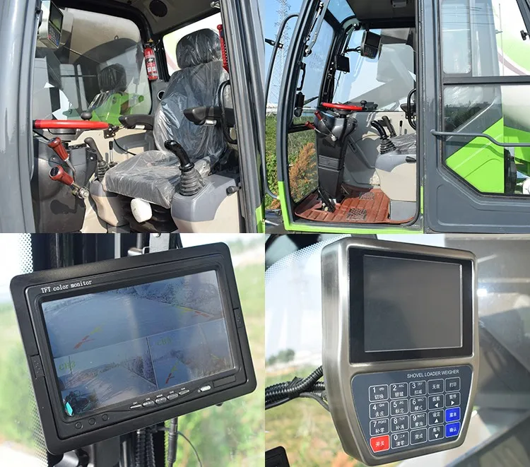 Our driver's cab is much more spacious than other's. It is a kind of crawler excavator style cab. The anatomic seat is with function of flexible suspension and height adjustment .The electronic weighing system is available here. The Load cells are acting on the drum and technical data are displayed on the shovel loader weigher inside the cab.Two sets of joystick control system are situated on the two sides of driver's seat. The panoramic color monitor is near the steering wheel. The operation situation from the four sides of machine could be shown clearly on the Color Monitor, which increase the driving safety . Fire Extinguisher , Safety Hammer and Air Conditioner are also equipped inside the cab.