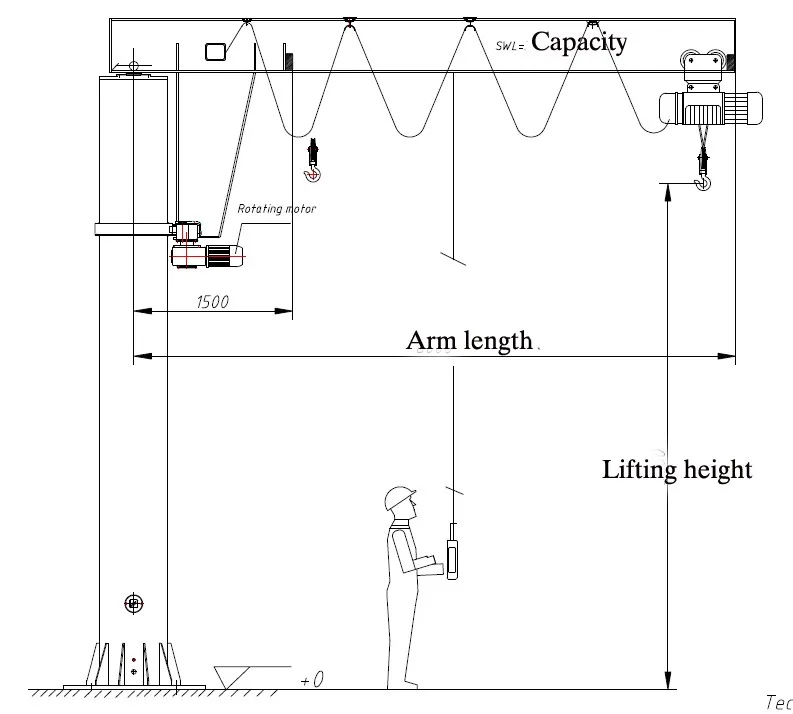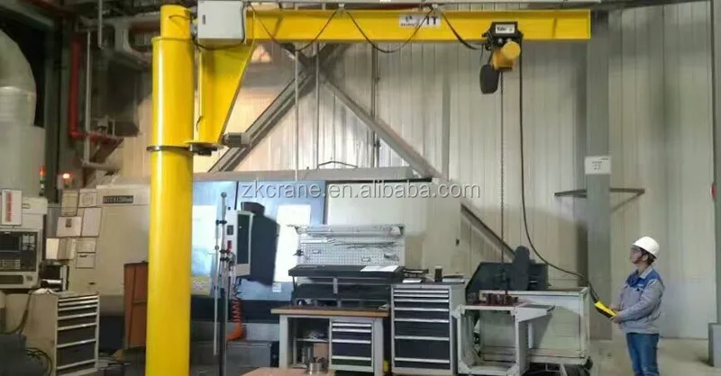 Free standing Jib crane is mainly composed of top column, low column, main girder, main girder pole, electric hoist, rotation mechanism and electrical system, etc.Normally control model of jib crane with remote control or pendent line with press button or both.