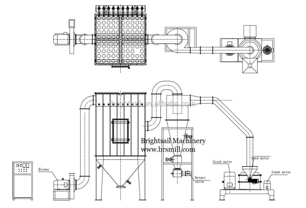 The machine is made up of three parts:main machine,auxiliary machine and electric control box. It has the properties of wind selection,having no sieve or net,and an even granularity of the processed material.