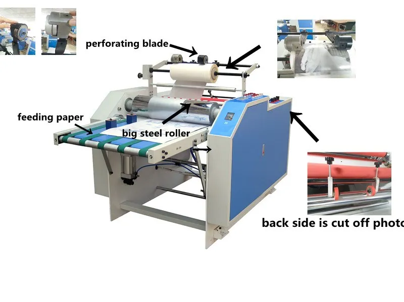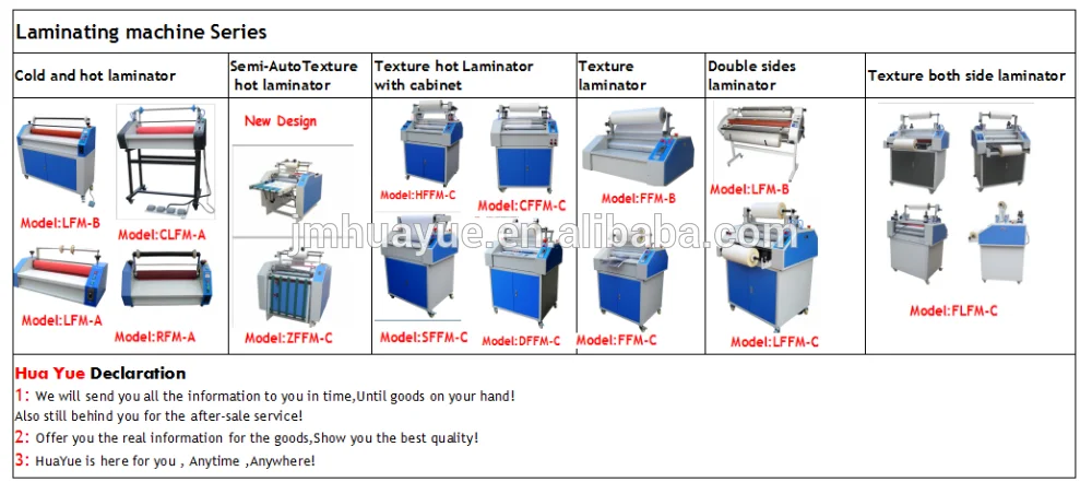1. Laminating film for photos ,paper ,printing .etc 2. A variety of Pattern can be changed ,beautiful shape 3. General and Pattern laminating rollers 4. Automatic fix temperature 5. Low cost , environmential protection 6. photos ,etc ,can be waterproof ,wear-resistant after laminating 7. Can use BOPP hot lamination film. Big diameter stainless steel roller is 18cm. 8.auto feeder conveyor belt with electric control device to adapt different type of paper materials . 9.Clear texture design will not deformation. with cutting film and breaking film functions.