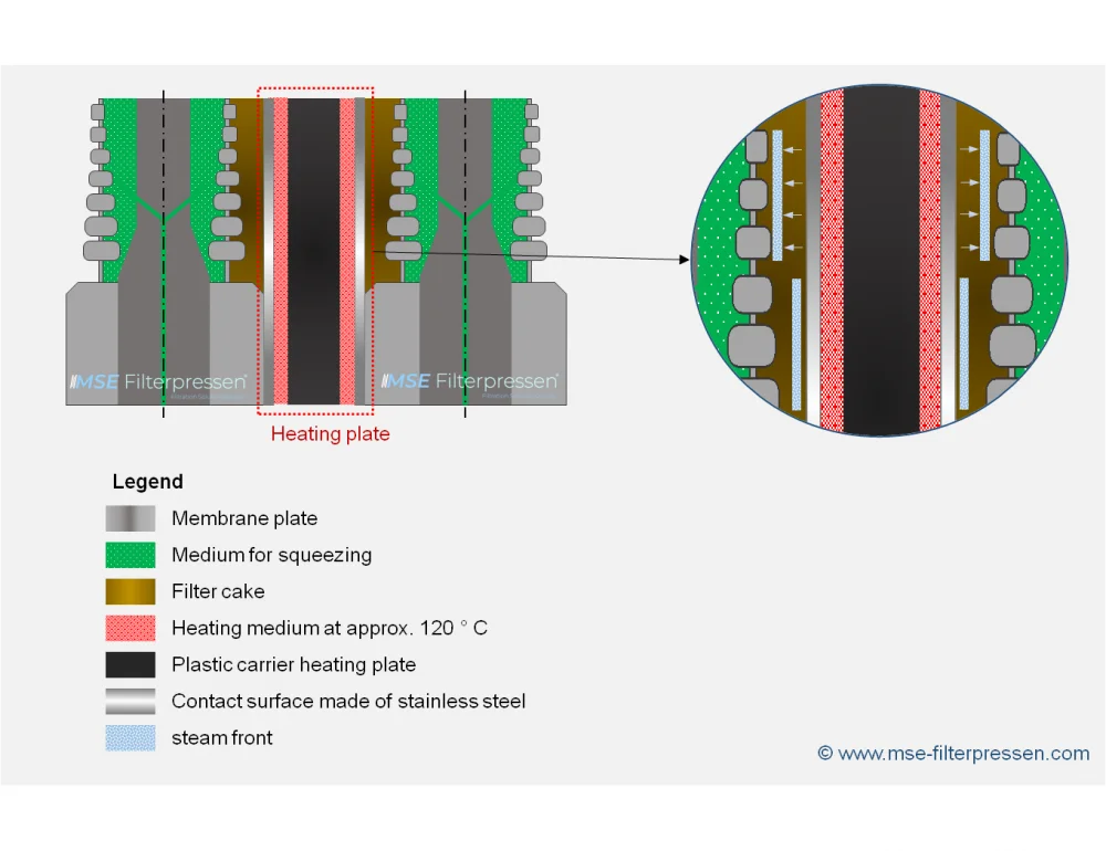 In contrast to the conventional method, the system consists of membrane filter plates and heat exchanger plates, which are installed alternately in a filter press. For thermal drying, hot steam and/or oil is applied to the working space behind the membrane and the filter cake is thermally dried accordingly. The advantage of this process is that a high dry matter content (DM content) of over 90% is achieved.