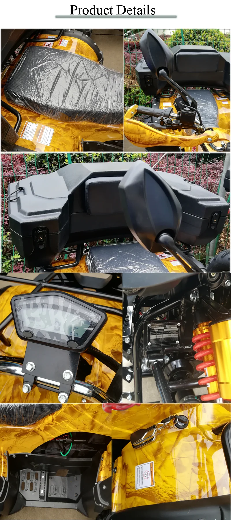 | Optional parts (extra price): | como color:+8$,plastic bright cover:+5$,remote:+6$, mirror+3$,electric winch +125$,rear tow hook+15$.Luxury digital speedmeter+45$.turn light+3$.covered edge+5$.backrest+5$.4 front big LED light+45$.rear box+125$ | |||