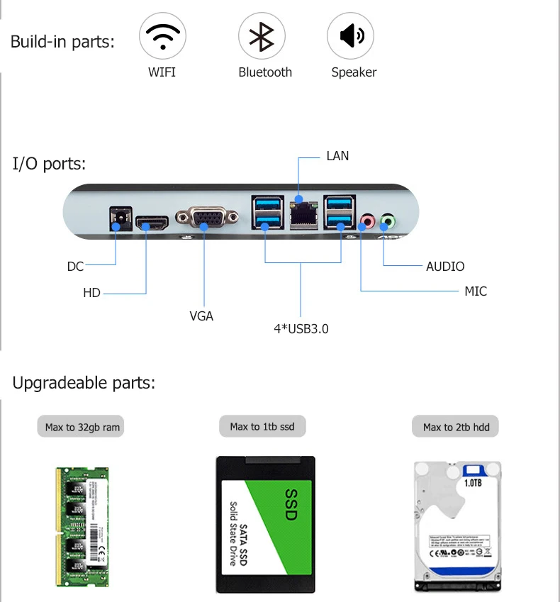 | Storage: | 1*M.2 SATA SSD/ 1*M-SATA SSD & 1*2.5 SATA SSD | |