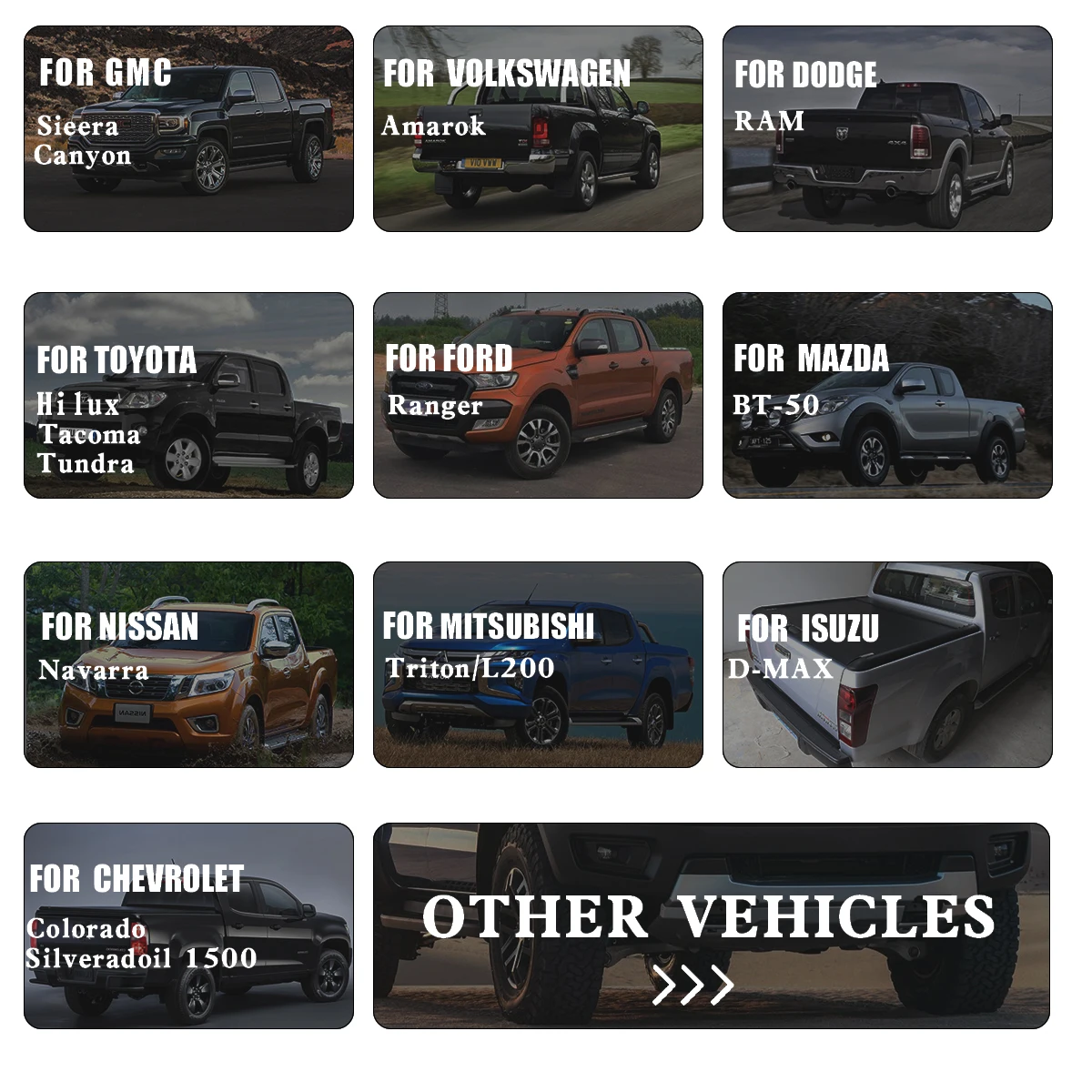| Car Model: | For Ford ranger; | Model: | Silverado 1500 HD Crew Cab Pick-up, Silverado 2500 HD Standard Cab Pick-up, Silverado 1500 Extended CAB, Silverado 2500 Crew CAB, Silverado 1500 Crew Cab Pick-up, Silverado 1500 Extended Cab Pick-up, Corsa Pick-up, Montana Pick-up, Silverado 2500 Crew Cab Pick-up, SILVERADO 1500, C2500 Pick-up; |