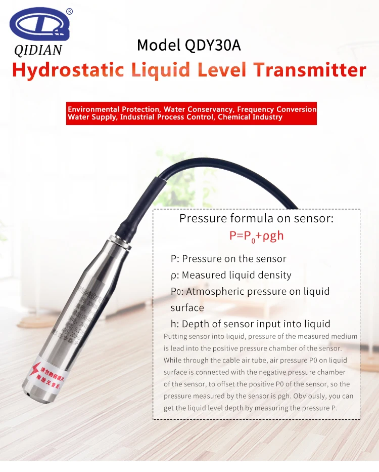 QDY30A submersible Water Level Sensor, its 304 &316 stainless steel and hermetically sealed housing make it suitable for most industrial liquids and oils. The welded housing is tested in-house via a helium leak tester to ensure proper protection. Ventilation tube in the cable automatically compensates for changes in atmospheric pressure above the tank. The conductors of the cable are also isolated from the outside environment to keep the level sensor operational for long-term use.