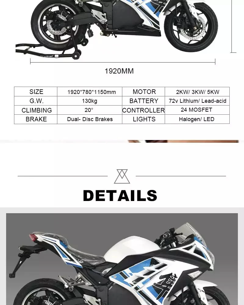 | DIMENSION (mm):2050×780×1100 | MOTOR:2KW-5KW, BRUSHLESS | TIRE (Vacuum Tyre): 120/70-16inch Vacuum Tyre | BATTERY:72V20AH -80AH, Lithium/Lead-acid | CHARGER:72V20A |
