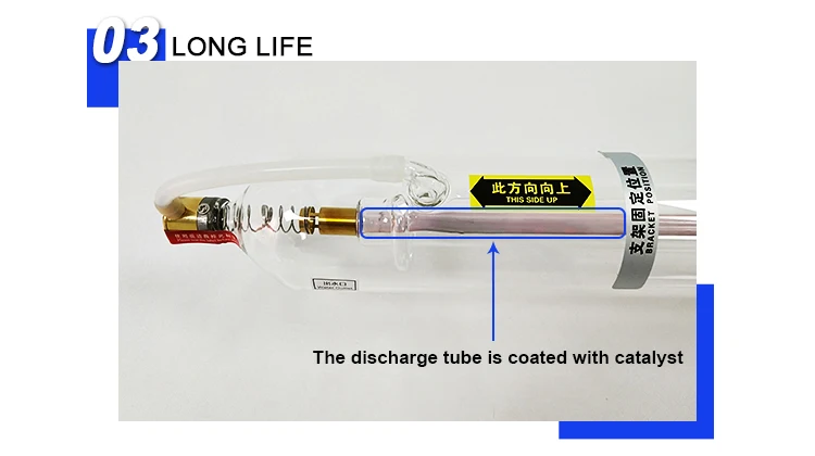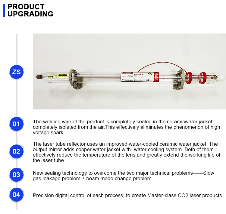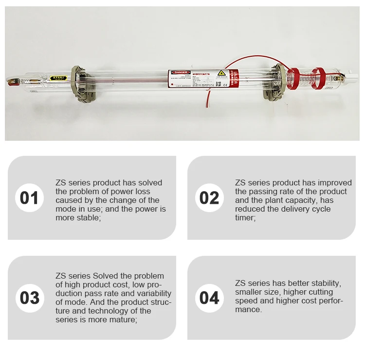 ZS series is the enhanced CO2 laser tube with 10000 hours lifespan and it began producing in September 2015 after years of development.The power of a single laser tube is up to 185W and this series has stable luminous performance. The discharge tube is coated with catalyst to increase its working life.This ZS series CO2 laser tube has the advantages of small size, good spot mode, high cutting speed compared to similar products.