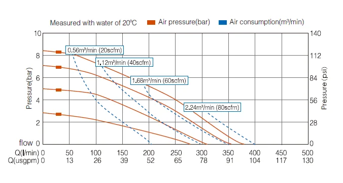 | Mode | Max.Suction Lift (dry\wet,m) | Max. particle diameter (mm) | Suction and discharge size (inch) | Air inlet size (inch) | Max. flow rate (L/min) | Max. air consumption (m3/min) |