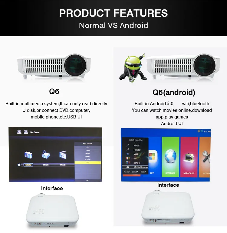 | Support resolution: | WVGA,XGA,WXGA,1920*1080; | Product Name: | Q6 Digital home projector; |