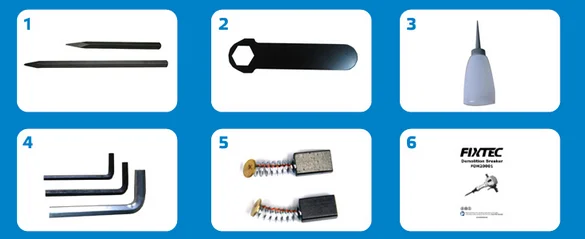 | Accessories | 1 set carbon brush; 1pc auxiliary handle, 1pc 28x550mm point chisel bit; 1pc 28x400mm point chisel ; 1pc oilcan |