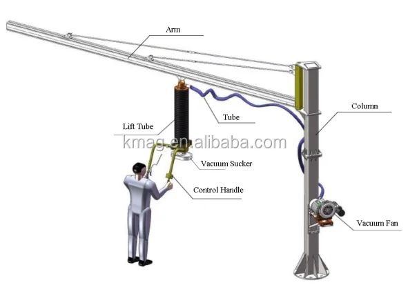 Machine handling: A person can simply operate the entire handling process on his own, and can handle up to 200kg. The most important thing is to save labor costs and reduce costs. We deliberately designed the safety device. When the machine suddenly loses power, the suction cup will slowly drop. Create a safe working environment for employees.