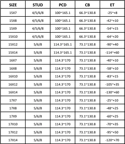 | PCD: | 100mm,108mm,112mm,114.3mm,115mm,120.65mm,120mm,127mm,139.7mm,143.1mm,165.1mm,98mm; | Hole: | 4,5,6,8; |
