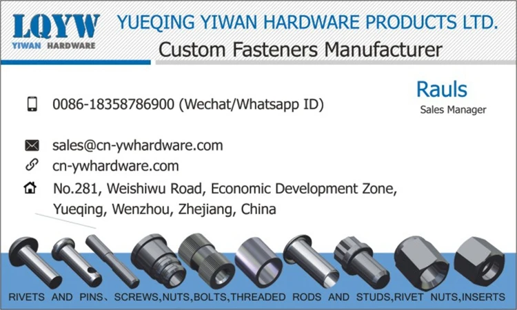 Yueqing Yiwan Hardware Products Co, Ltd. is set processing production as one of professional commit-ments and production of connectors, fasteners technology-based enterprises. Our scientific management,enter-prise follow the"customer first compliance, pioneering and innovative the quality sige Needle, to ensure that provide users with a more satisfactory products and services My company's main products are rivets, screws, nuts, bolts, copper nuts, Stainless steel screws, hex nuts, hex screw, rivet nuts, hollow rivets, shafts, pins, and othe types of non-standard fasteners.