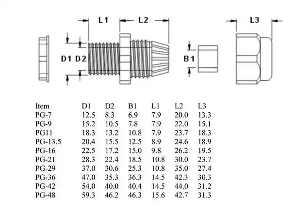 | Model | Thread Size | Cable Range (mm) | Thread O.D (mm) | Thread Length (mm) | Spanner Size (mm) |