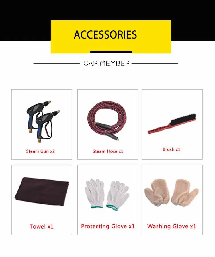 Answer: The machine is multifunctional for car interior, engine and exterior wash.Steam can expand and soften the dust, degrade the oil stains and kill the germs for disinfection, this process is called "Thermal Decomposition". Then the high pressure will make the steam blow off all the dirties on the cleaned object surface. Steam is made of water liquid which is idea agent with characteristic of high density, flexibility and molecular force, can easily wash off the dirties. While gas like state will make steam can be sprayed in each dead corder for thoroughly cleaning.