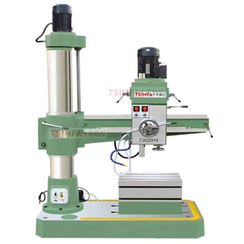 Radial drilling machine is mainly composed of base, inner column, outer column, rocker arm, spindle box and worktable. The inner column is fixed at one end of the base, and the outer column is sheathed outside, and the outer column can rotate 360 degrees around the inner column. One end of the rocker arm is a sleeve, which is set to move up and down the outer column. Because the screw and the outer pillar are connected together, and the lifting nut is fixed on the rocker arm, the rocker arm cannot rotate around the outer column, and can only be rotated with the outer column. The spindle box is a compound part, which is composed of main drive motor, spindle and spindle transmission mechanism, feed and speed changing mechanism, and operation mechanism of machine tool. The spindle box is mounted on the horizontal guide rail of the rocker arm and can be operated by the Handwheel to move along the rocker arm in the horizontal guide rail.