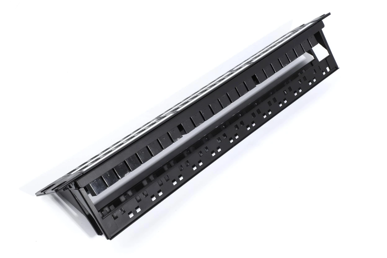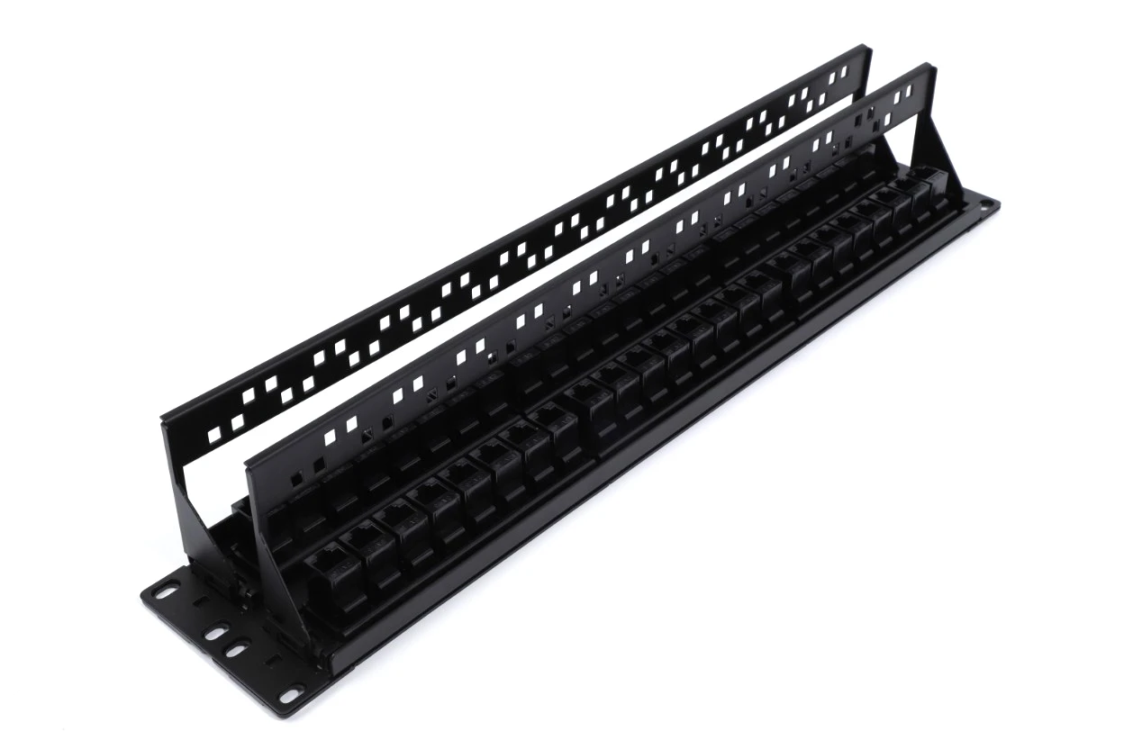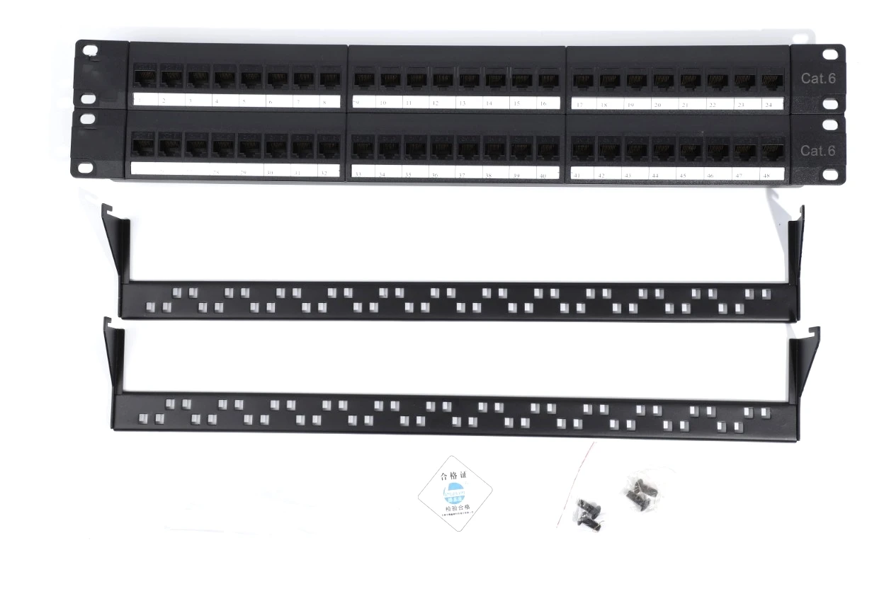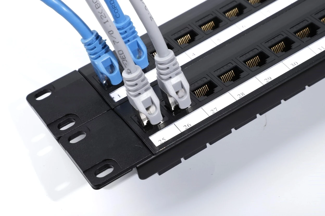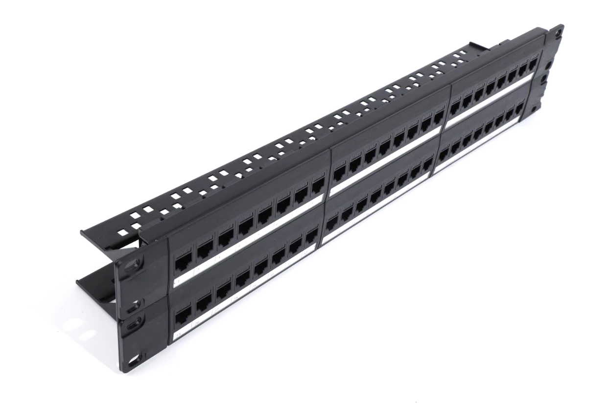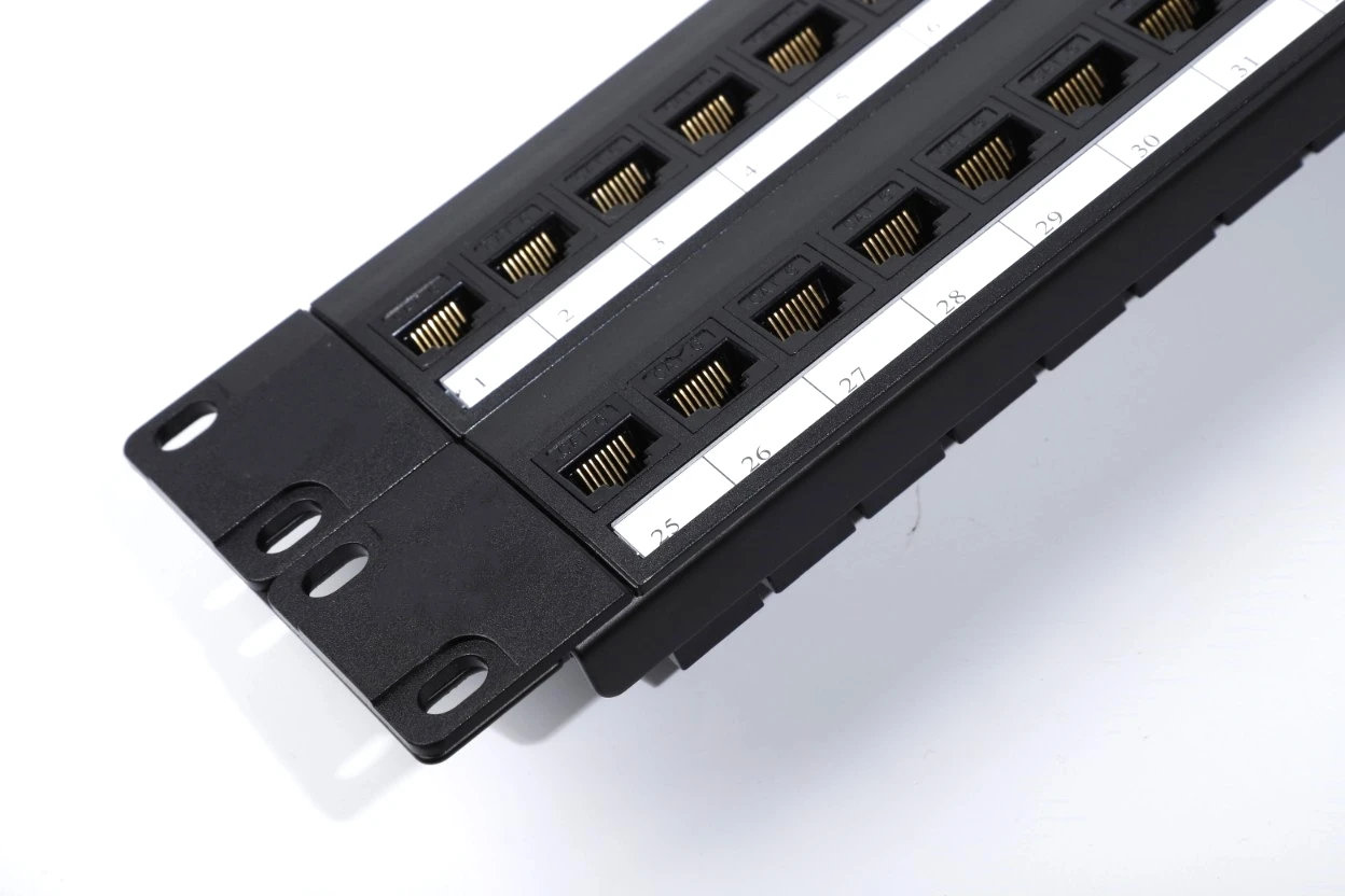 When building structured cabling systems, patch panels are used in racks and telecommunication cabinets for cable mounting in order to provide a high-quality commutation. A separate patch panel port is designated for each line. A patch panel is a block of jacks, the number of which corresponds to that of ports. E.g., a block of 24 jacks is a 24-port panel. Numerical markings are put on the ports at the front of the panel. At the back of the panel contacts contain colour and numerical markings. There are areas for additional marking. Patch panels differ in the number of ports, category and mounting technique. By the number of ports, 12-, 24- and 48-port patch panels are most widely spread. By the standards, category 5e and 6 patch panels are mostly used. The main commutation mean is patch cords (a sections of cable, usually up to 5 m long, of the appropriate category with plug-type connections at the ends). They are used to connect patch panel ports, active equipment, sockets at the working places (PC, telephones, printers, etc). The cable is laid to each port and using a special tool is mounted (connected to) in the IDC module (IDC is Insulation Displacement Connection). There are the following types of IDC modules: of type 110 , Krone and Dual IDC (universal). Depending on the module type different tools are used for cable mounting. Dual IDC is a universal module and admits use both 110 type tool and Krone type tool for cable mounting. Panels may be mounted on the wall and in 19" telecommunication cabinets, racks and frames. Some kinds of panels are produced according to standard 10".