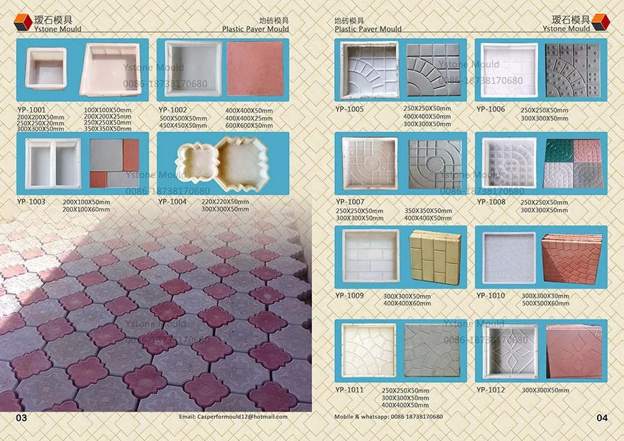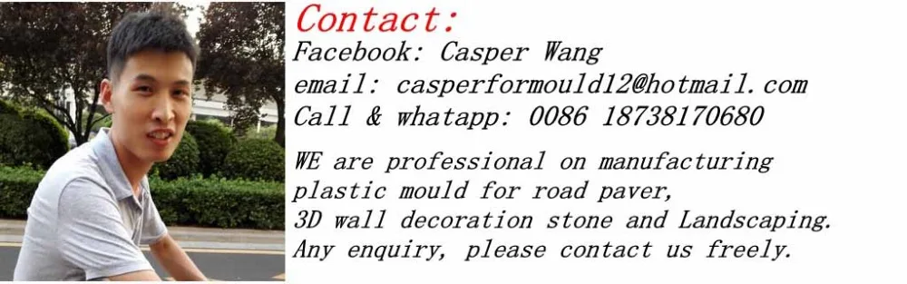 We have a variety of plastic, rubber, PVC, silicone and Polyurethane moulds, which covers a great range: interlock paver mould, curbstone mould, window frame mould, manhole and cover mould, roman pillar and column mould, baluster mould, flower pot & planter mould, concrete stamp mat, Silicone culture stone mould, and also we supply the related production machine: vibrating table, concrete mixer, stone crusher, mould releasing table, portable clay brick making machine and culture stone production line. The moulds are perfect on beauty of concrete for road pavement, Garden decoration, landscaping and villa culture stone decoration.