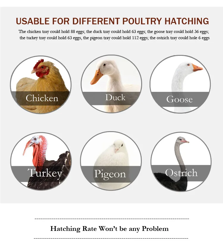 | Usage: | Chicken,Reptile,Bird,Emu,Ostrich,Turkey,Goose,Duck; | Accessories: | egg tester, motor, limit switch, sprocket; |