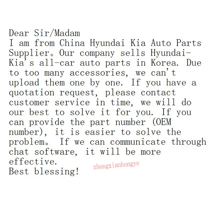 I am from China Hyundai Kia Auto Parts Supplier.Our company sells Hyundai-Kia's all-car auto parts in Korea. Due to too many accessories, we can't upload them one by one. If you have a quotation request, please contact customer service in time, we will do our best to solve it for you. If you can provide the part number (OEM number), it is easier to solve the problem. If we can communicate through chat software, it will be more effective.
