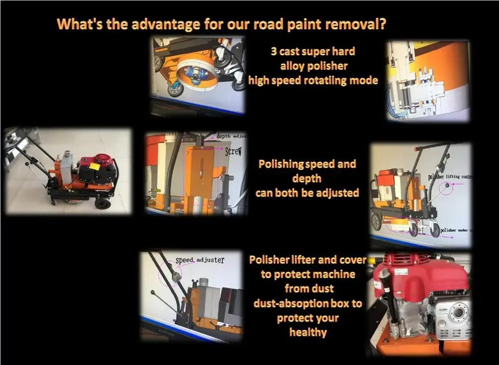 This equipment uses Honda diesel engine, the polisher use high quality, durable super hard alloy. The machine has dust discharge function, point oscillation type polishing. Use the engine to lead the polisher to run in rapid speed, under the rotating centrifugal force, the polisher will polish the raised section of the road to remove the old marking paint. All in all, this product’s function is :rapid speed, enough power, small oscillation, low noise, safe operation and dustproof.