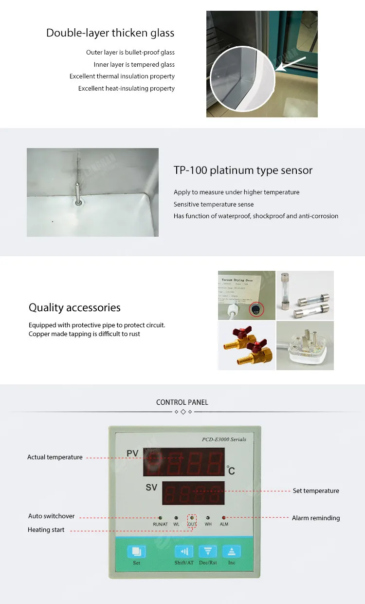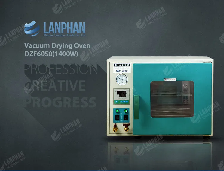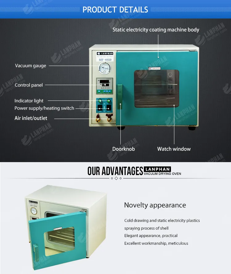 The built-in microcomputer processor make use of electric signal which is generated by feedback value on-off to control the heating element, through PID self-tuning(manual adjustment is available), amended parameter will automatic locking and the correct signal constants the temperature within setting range, after the temperature buffer is stable, temperature difference is lower than ±1℃ under normal pressure and vacuum pressure. Front panel's "vacuum meter" displays the vacuum degree of working room. Special purpose bleeder valve can pump air and do vacuum drying. Other switches and control device are also set in the front panel, which has the advantages of easy to operate, light weight, save electricity and high thermal efficiency, especially suitable for the drying process of a few sample.