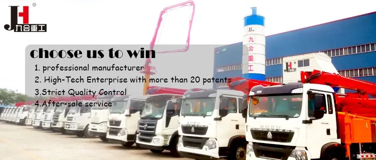 JIUHE is specialized in researching, manufacturing, and selling concrete machines such as concrete mixing machine, concrete pumping machine, concrete placing machine and other Heavy Industry machinery. We are New High-Tech Enterprise with more than 20 Patents. Choose us, you can absolutely feel free on after-sale service. Customer Satisfaction is our pursuit, Long-term cooperation is our goal, Mutual benefit and win-win result is our principle. Any products interest you, Kindly contact us, Quality machine together with Warm and attentive service are waiting for you!
