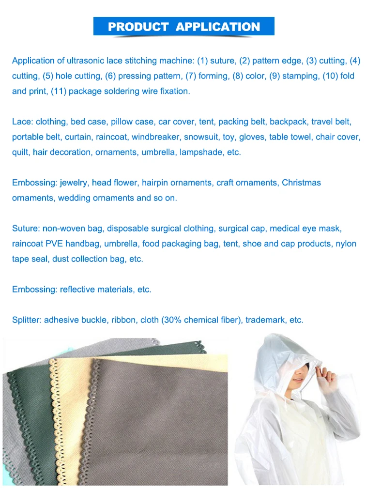 6. Ultrasonic lace machine uses ultrasonic wave directly to wrap, stamping and pressing all kinds of shapes on all kinds of materials, and adjusts power according to different fabrics and thickness.