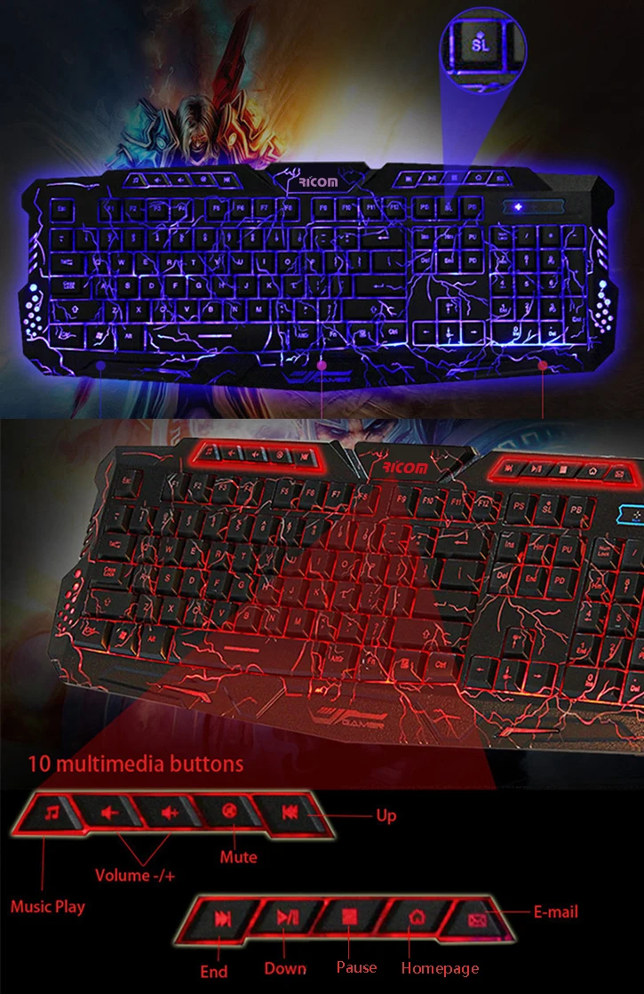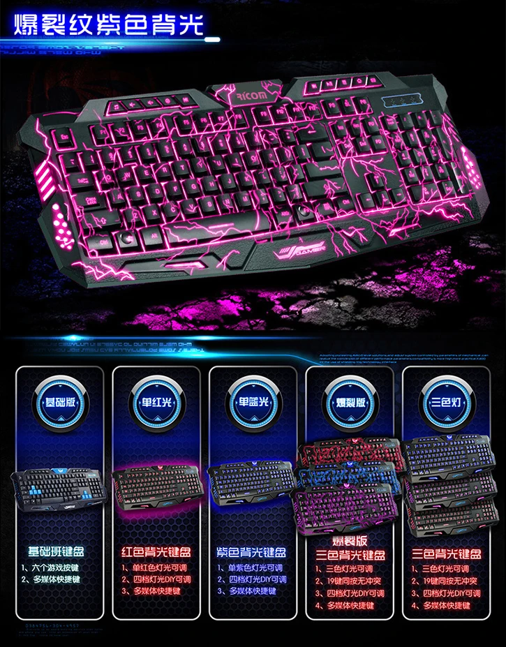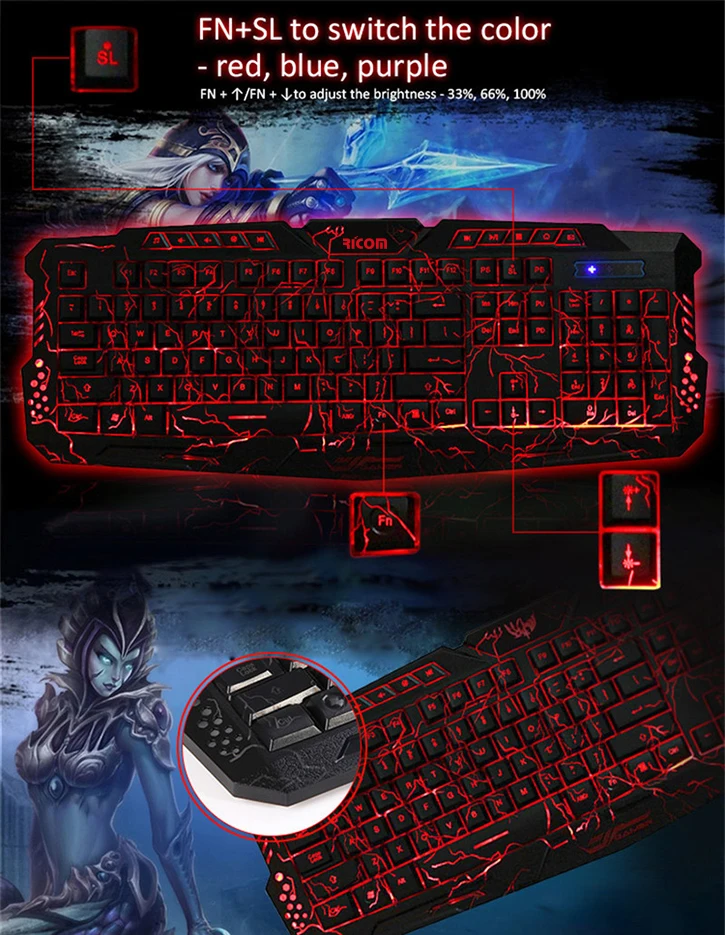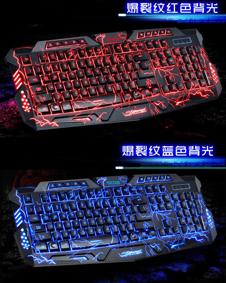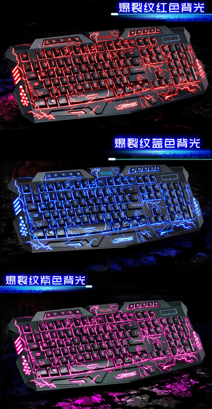 This gaming backlit keyboard is designed for game playing. Crack backlight of 3 colors is full of personality. Big keys and heavy weight make gaming operations more easy. High-quality workmanship and exquisite detail, all for bringing user joyful gaming experience.