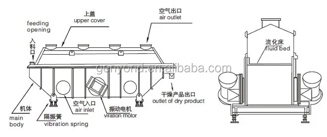 Raw material is fed into the fliud bed dryer from the inlet and moves forward continuously along with the level of fluidized-bed under the action of vibration.The hot air passes through fluidized-bed and carries out heat exchange with damp raw material.Then the damp qir is exhausted out through cyclone separator and duster the dry raw material is discharged through discharge outlet.