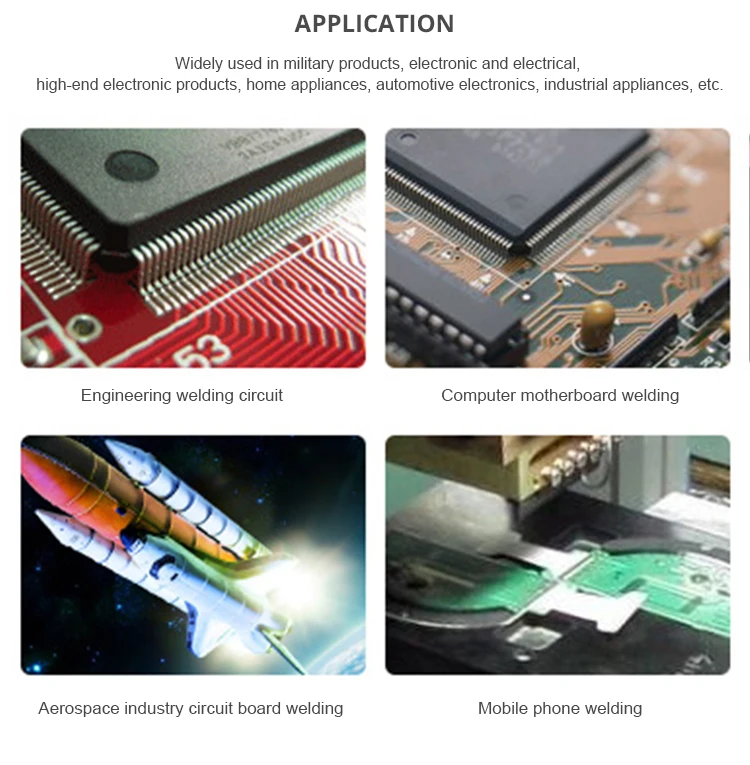 4.Widely used in military industry, precision electronic instruments, precision medical instruments, high-end electronic products, automotive electronics and other products of manual dip welding and wave soldering;